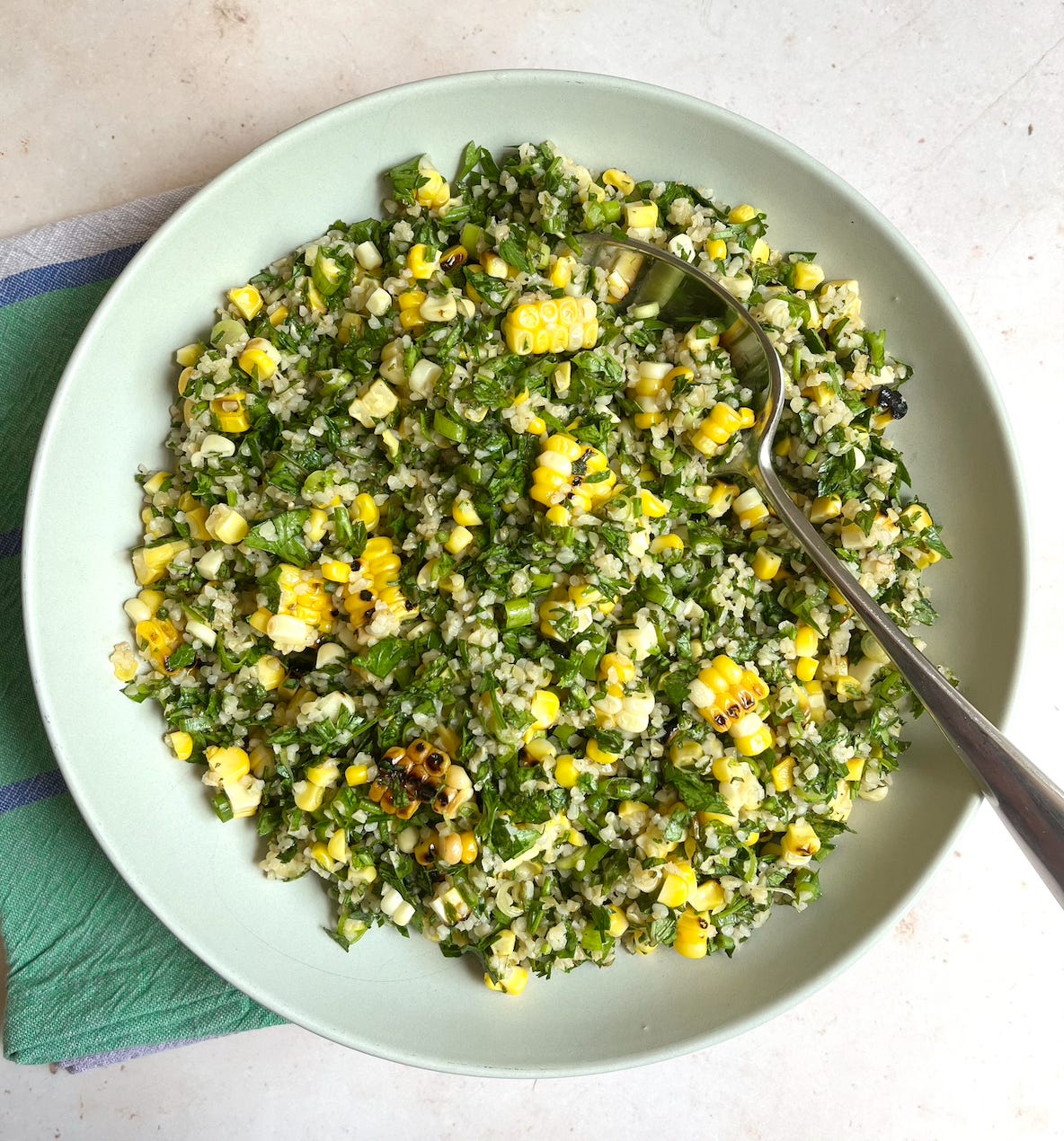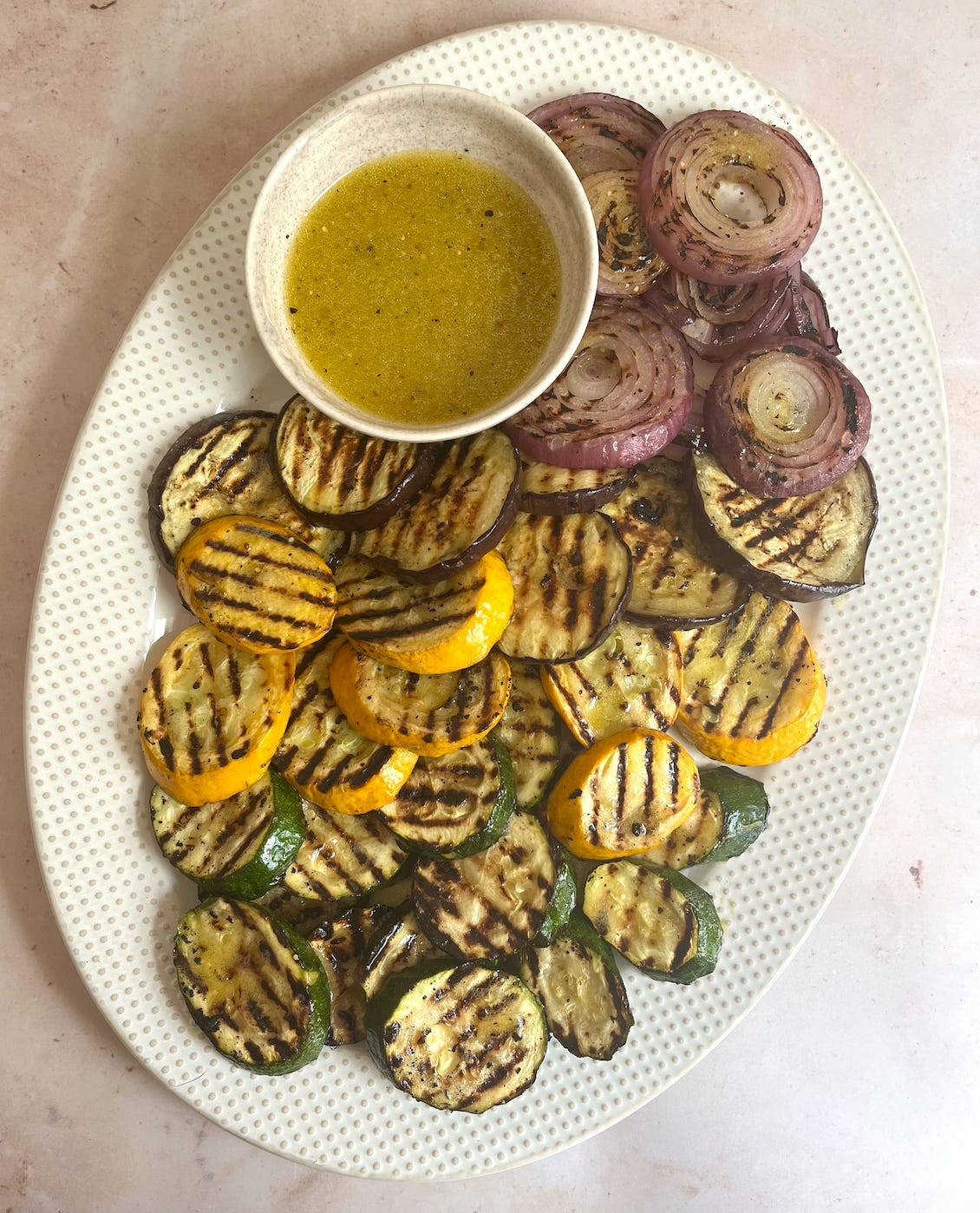Obviously, any and all vegetables can be thrown onto the grill. They cook quickly and they’re a perfect way to round out any plant-based menu. These days, I like to grill seasonal vegetables, such as zucchini, summer squash, eggplant, peppers and chiles, tomatoes, corn, and onions, and fruits, such as pineapple and stone fruit (peaches, plums, and nectarines). I’ve incorporated a few of these vegetables into two side dishes that I’m sharing today. Corn on the cob is grilled and the kernels are stripped and added to a fresh and herbaceous tabbouleh salad. Zucchini, summer squash, eggplant, and red onions take a quick turn on the grill before being finished with a marinade dressing while they’re still hot. This way, you maintain all of the fresh marinade flavors that you might otherwise lose if they were added before grilling. I kept this one simple, with champagne vinegar, two kinds of mustard, grated garlic, and red pepper flakes, but you can play around with any other flavors you like, depending on what else you’re serving with your menu.